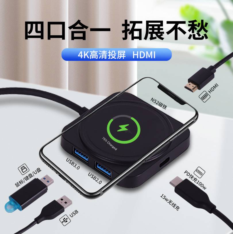 type-c一拖四 高速集线器 电脑usb分线器拓展高清4K 15W无线快充